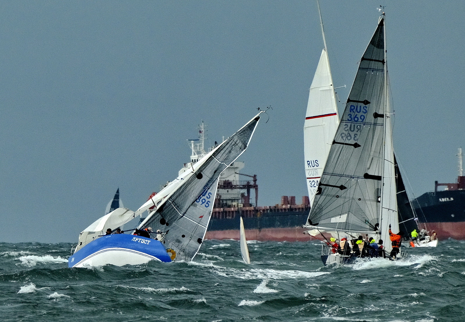 Со старта до знака №1 яхты прорывались через высокие волны, то и дело теряясь между валами. Несколько "Конрадов" ушли в брочинг, но все выстояли. На "Артисте" после огибания сломался надвое спинакер-гик, на который тут же наложили "шину" - экипаж не стал выходить с гонки, в продолжил бороться.